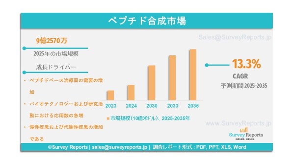 Survey Reports LLCは、2026年3月に「ペプチド合成市場:APIの種類別(ジェネリックAPI、新規化学物質)、ペプチド合成手法の種類別(化学合成、非化学合成)、化学合成手法の種類別(固相合成、液相合成、ハイブリッド相合成)、運用規模別(商業規模、前臨床/臨床規模)、企業規模別(小規模企業、中規模企業、大規模および超大規模企業)―世界市場分析、動向、機会および予測(2025年~2035年)」と題する調査レポートを発行したと発表した。本レポートはペプチド合成市場の予測評価を提供するものであり、成長要因、市場機会、課題、および脅威を含む複数の主要な市場ダイナミクスを強調しているものである。
