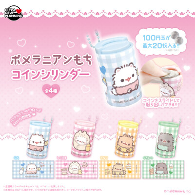 赤ちゃんポメラニアンもち達が可愛いコインシリンダーは、全4種!100円玉が最大20枚入ります。
