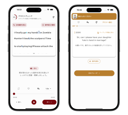 • 瞬間英作文: 監修された英語台本をベースに、ネタ独特の表現を瞬時に英語で出すトレーニング