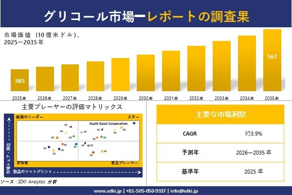 SDKI Analytics(本社:東京都渋谷区)は、このたび、2026年03月19に「グリコール市場調査レポート:2026-2035年の市場規模、シェア、傾向の予測」を発表しました。グリコールに関する市場調査レポートには、統計的および分析的アプローチを使用した予測評価が含まれています。この調査レポートでは、一次および二次調査方法を使用して分析された主要な業界洞察を通じて将来の傾向を理解できるようにすることで、主要な市場動向を読者に説明しています。