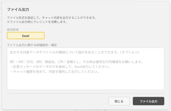 「Excelファイル出力機能」は、AIとの対話内容を自然言語での指示でExcelファイルに変換・出力する機能です。単なるテキスト出力ではなく、利用者が望むフォーマットへと自動的に整形します。概要は以下の通りです。