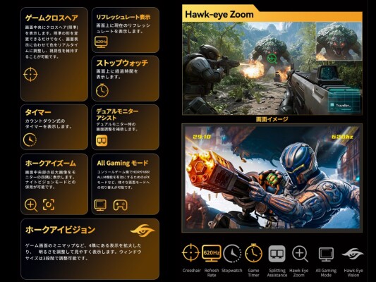 明暗のディテールを強調し、さらに鮮やかな映像を楽しめるHDR機能をはじめ、ゲームプレイやグラフィックを最大限に楽しむための支援機能を多数搭載しています。