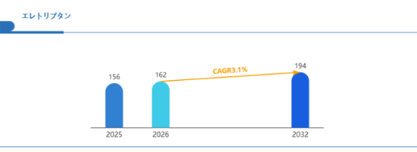 特許満了後のジェネリック医薬品の参入は、価格低下と医療機関での採用拡大を促進します。エレトリプタンにおいてもジェネリック製剤の供給が進むことで、医療保険制度の制約がある地域やコスト重視の医療機関での使用が増加することが期待されます。これによりエレトリプタンの処方件数が増加し、市場浸透率向上の機会となります。