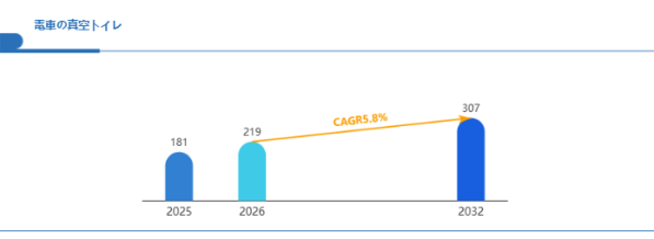 電車の真空トイレは鉄道車両の付帯設備でありながら、車両軽量化、環境規制対応、旅客サービス品質向上という複数の要求を同時に満たす高付加価値機器として位置付けられる。特に高速鉄道や長距離列車では、車内衛生環境の向上がブランド価値に直結するため、鉄道事業者にとって重要な装備となっている。また、車両更新需要や既存車両の改修市場においても導入が進んでおり、鉄道インフラ投資の拡大と連動する装置市場として注目されている。