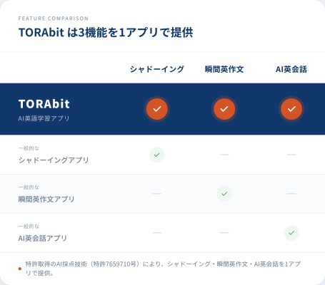 TORAbitは「AIシャドーイング」、「AI瞬間英作文」、「AI英会話」の3機能統合の英語学習プラットフォームです。日常・ビジネス・海外出張・会議など幅広いシーンをカバーする2,000以上の教材と、1回5分から「練習 → 採点 → 改善」が完結する効率的な学習設計で、忙しいビジネスパーソンの英語力向上をサポートします。
