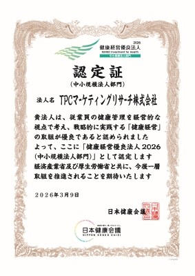 この程、TPCマーケティングリサーチ株式会社(本社=大阪市西区、代表取締役社長=松本竜馬)は、2026年3月10日付で経済産業省と日本健康会議が共同で実施する「健康経営優良法人認定制度」より、中小規模法人部門における「健康経営優良法人2026」に認定されました。