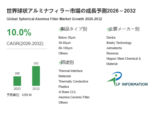 LP Informationの「世界球状アルミナフィラー市場の成長予測2026~2032」(https://www.lpinformation.jp/reports/583023/spherical-alumina-filler)によれば、当該市場は2026~2032年の予測期間においてCAGRが10.0%と見込まれ、2032年までに市場規模は5.82億米ドルに達する見通しである。市場の中核価値は「熱を逃がしつつ電気を通しにくい」という材料要件を、量産加工性と両立させる点にある。球状化によって高充填でもレオロジーが設計しやすく、薄肉化・微細化・高出力化が進む電子部材の制約条件に適合しやすい。すなわち本市場は、単なる粉体供給ではなく、熱設計・実装設計・材料設計が交差する“熱マネジメントの基盤材”として形成される市場である。