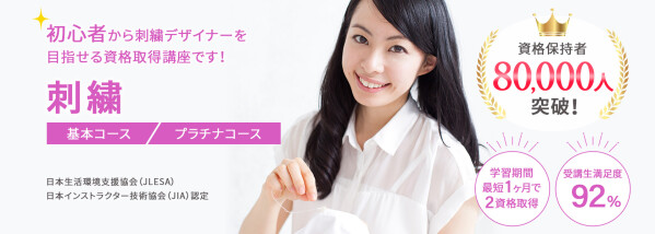 講座で学ぶ内容は日本生活環境支援協会の「刺繍アドバイザー」(https://www.nihonsupport.org/syugeishikaku/shisyu/)、日本インストラクター技術協会の「刺繍デザイナー」(https://www.jpinstructor.org/shikaku/shisyu/)それぞれの資格試験対策になっています。