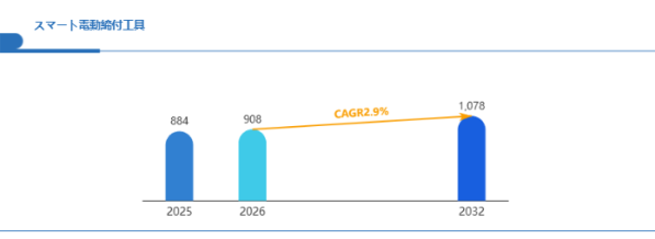 Global Reports調査チームの最新レポート「グローバルスマート電動締付工具市場規模、主要企業シェア、ランキング分析レポート【2026年版】」によると、2026年の908百万米ドルから2032年には1078百万米ドルに成長し、2026年から2032年の間にCAGRは2.9%になると予測されています。