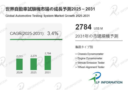 調査機関LP Informationの「世界自動車試験機市場の成長予測2025~2031」(https://www.lpinformation.jp/reports/292801/automotive-testing-system)によれば、グローバル自動車試験機市場は予測期間中にCAGR 3.4%で推移し、2031年には市場規模が27.84億米ドルに達すると見込まれている。この成長率は急激ではないものの、自動車産業に不可欠な基盤投資として当該分野が確固たる需要を維持していることを示している。電動化や安全規制強化を背景に、各国メーカーや研究開発拠点が試験設備への投資を継続している点が市場の底堅さを支えている。このように、Automotive Testing System は車両性能の高度化と規制対応を支える“不可欠なインフラ”として位置づけられており、投資の継続性と安定的成長が見込まれる市場であることが、LP Information のデータによって裏付けられている。