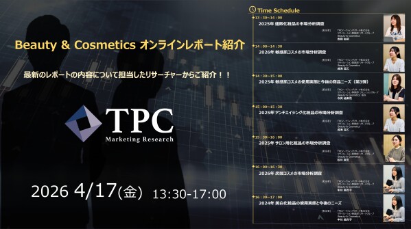 リサ・リューション事業を展開するTPCマーケティングリサーチ株式会社(代表取締役社長:松本 竜馬)は、2026年4月17日にBeauty & Cosmeticsオンラインレポート紹介を開催いたします。