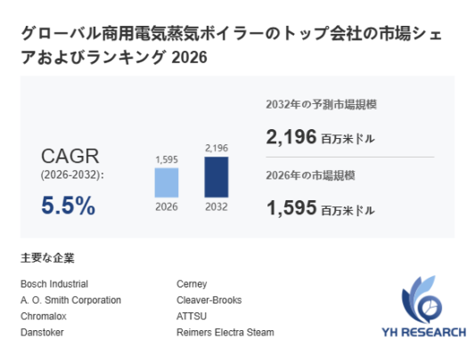 YHResearch調査チームの最新レポート「グローバル商用電気蒸気ボイラーのトップ会社の市場シェアおよびランキング 2026」によると、2026年の1595百万米ドルから2032年には2196百万米ドルに成長し、2026年から2032年の間にCAGRは5.5%になると予測されています。