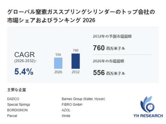 YHResearch調査チームの最新レポート「グローバル窒素ガススプリングシリンダーのトップ会社の市場シェアおよびランキング 2026」によると、2026年の556百万米ドルから2032年には760百万米ドルに成長し、2026年から2032年の間にCAGRは5.4%になると予測されています。