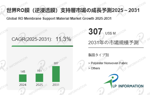 LP Information調査チームの最新レポートである「世界RO膜(逆浸透膜)支持層市場の成長予測2025~2031」(https://www.lpinformation.jp/reports/598967/ro-membrane-support-material)によると、2025年から2031年の予測期間中のCAGRが11.3%で、2031年までにグローバルRO膜(逆浸透膜)支持層市場規模は3.07億米ドルに達すると予測されている。これは、グローバルな水ストレスの深刻化、都市化・人口増加、工業化の進展、気候変動による水資源の希少化が背景にある。特に、海水淡水化プラントの拡充、産業排水の再利用、排水ゼロ(ZLD)技術への注目、都市部での上下水道の老朽化などがRO膜ソリューションへのニーズを押し上げるもっとも強力なドライバーである。支持層はその基盤として、RO膜の安定運用と高効率ろ過を支える必須部品であり、市場全体の成長に直結する。“水”という“ライフラインのインフラ”を技術で支える、まさに「見えないバックボーン市場」が拡大していることを示す。