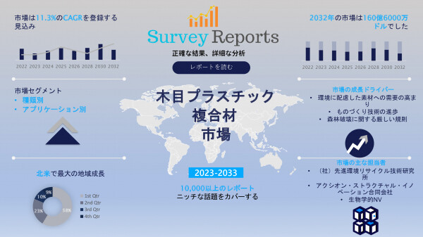 Survey Reports LLCは、2026年4月に調査レポートを発行したと発表した。木質プラスチック複合材(WPC)市場は、タイプ別(ポリエチレン、ポリ塩化ビニル、ポリプロピレン、その他)に分類され、用途別( 建築製品、自動車部品、工業製品および消費財、その他) - グローバル市場分析、動向、機会および予測、2024年から2033年」は、ウッドプラスチックコンポジット(WPC)市場の予測評価を提供している。このレポートは、ウッドプラスチックコンポジット(WPC)市場の成長促進要因、市場機会、課題、脅威など、いくつかの重要な市場力学を強調している。