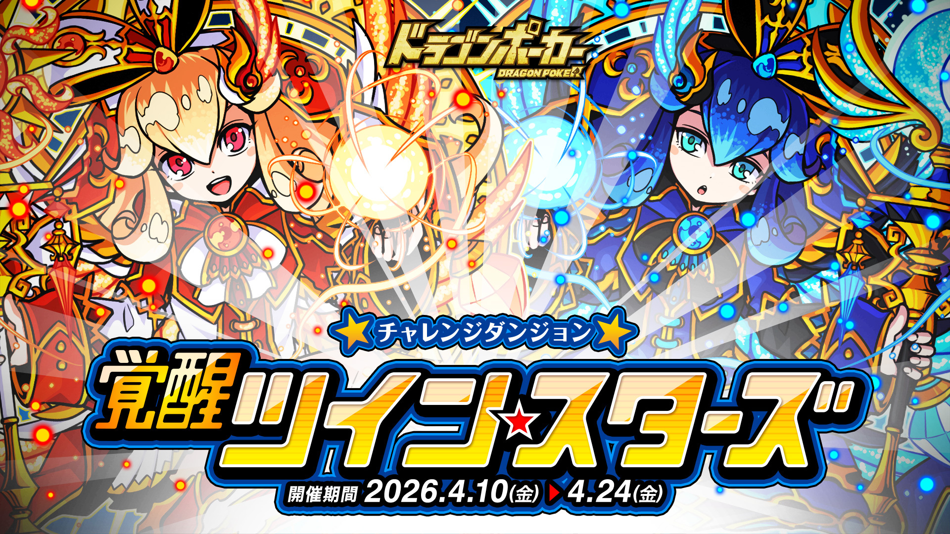 株式会社アソビズム(本社:東京都千代田区、代表取締役:大手智之)は、App Store・Google Playにて好評配信中のリアルタイム合体カードバトル『ドラゴンポーカー』で、2026年4月10日(金)よりチャレンジダンジョン「覚醒ツインスターズ」を開催いたします。