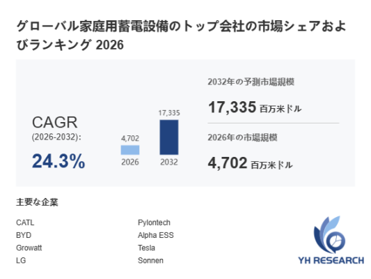 YHResearch調査チームの最新レポート「グローバル家庭用蓄電設備のトップ会社の市場シェアおよびランキング 2026」によると、2026年の4702百万米ドルから2032年には17335百万米ドルに成長し、2026年から2032年の間にCAGRは24.3%になると予測されています。