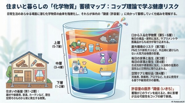 【発症を防ぐ鍵:「予防原則」に基づくアプローチとコップの理論】 化学物質過敏症やアレルギーなどの健康被害を防ぐためには、未解明な健康リスクに対しても科学的確実性を待たずに対策を講じる**「予防原則」**が不可欠です。人間の体を「コップ」に例えると、日々の生活で蓄積された化学物質がコップの限界(閾値)を超えて溢れ出した瞬間に、様々な病気や症状として発症します。「植物クリーニング」によって入居前のまっさらな空間からリスク物質を徹底排除することは、この「コップに水を溜めない(閾値を超えさせない)」ための、最も効果的で根本的な未病対策(0次予防)となります。