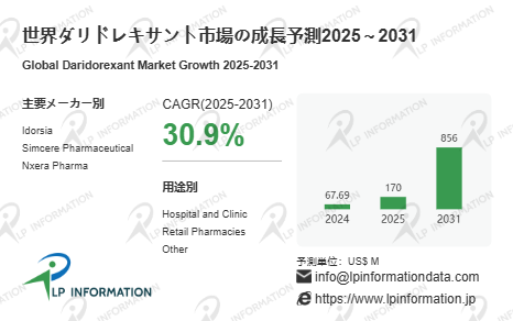 LP Information調査チームの最新レポートである「世界ダリドレキサント市場の成長予測2025~2031」(https://www.lpinformation.jp/reports/596734/daridorexant)によると、2025年から2031年の予測期間中のCAGRが30.9%で、2031年までにグローバルダリドレキサント市場規模は8.56億米ドルに達すると予測されている。世界的に、不眠や睡眠障害は高齢化、ストレス増加、ライフスタイルの変化により、慢性化・普遍化している。こうした背景のもと、睡眠改善への医療的アプローチが社会全体で拡大しており、従来の一時的な睡眠補助から、慢性不眠の根治に近づく「オレキシン受容体拮抗薬」への期待が高まっている。ダリドレキサントの導入によって、不眠市場は医薬品化が進み、従来の睡眠補助サプリや一時的な鎮静薬だけでは満たせなかった“睡眠の質と持続性”という新たな価値基準で成長する構造に変化している。