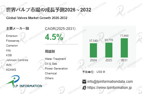 LP Information調査チームの最新レポートである「世界バルブ市場の成長予測2026~2032」(https://www.lpinformation.jp/reports/577893/valves)によると、グローバルバルブ市場は、2025年から2031年にかけて年平均成長率(CAGR)4.5%で拡大し、2031年には776.6億米ドルに達すると予測される。この市場は石油・ガス、上下水道、化学、発電といった基幹産業の需要に支えられ、比較的安定した成長軌道を描く。成熟市場では更新需要や性能向上への投資が主な成長要因であり、新興市場ではインフラ整備や産業拡大に伴う需要増が顕著である。バルブは長寿命で保守可能な製品であるため、短期的な変動の影響は受けにくく、全体として緩やかで持続的な市場成長を示す傾向がある。特に規制対応や安全基準の厳格化も、市場の堅調な推移に寄与している。