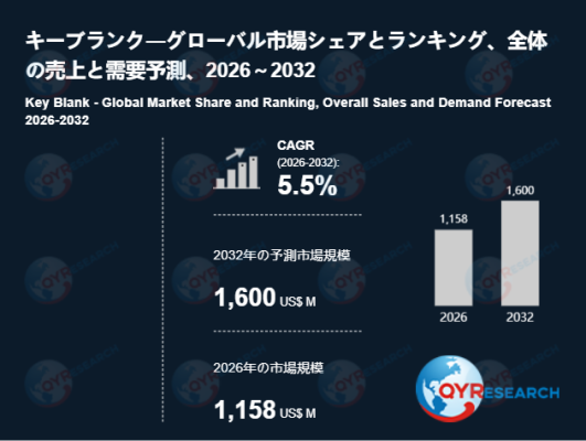 QYResearch調査チームの最新レポート「キーブランク―グローバル市場シェアとランキング、全体の売上と需要予測、2026~2032」によると、キーブランクの世界市場は、2025年に1020百万米ドルと推定され、2026年には1158百万米ドルに達すると予測されています。その後、2026年から2032年にかけて年平均成長率(CAGR)5.5%で推移し、2032年には1600百万米ドルに拡大すると見込まれています。