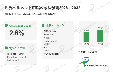LP Information調査チームの最新レポートである「世界ヘルメット市場の成長予測2026~2032」(https://www.lpinformation.jp/reports/578985/helmets)によると、2025年から2031年の予測期間中のCAGRが2.6%で、2031年までにグローバルヘルメット市場規模は79.58億米ドルに達すると予測されている。高成長の背景には三つの潮流がある。第一に、世界的な交通安全政策の強化である。二輪車利用の多い新興国ではヘルメット着用義務化が進み、先進国では自転車用ヘルメット需要がスポーツ用途と通勤用途の双方で高まっている。第二に、スポーツ・レジャー分野の拡張である。スノースポーツ、モータースポーツ、アウトドア活動の普及により、高機能・高デザイン性モデルの需要が上昇している。第三に、産業安全領域での投資拡大である。建設、製造、物流などの現場で安全管理強化が進み、耐衝撃性と快適性を両立するヘルメットの導入が増えている。加えて、軽量素材やスマート機能の採用がプレミアム市場を形成し、需要構造を高度化している。