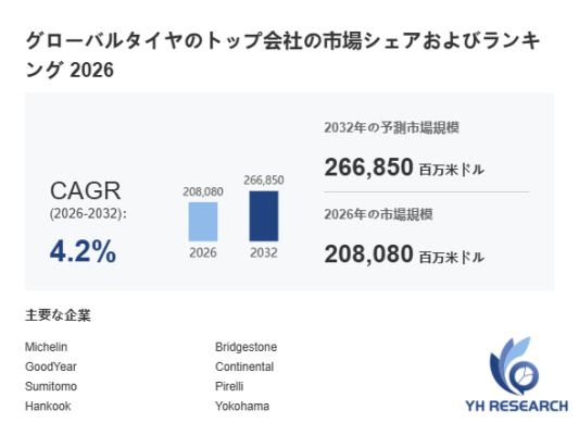 YHResearch調査チームの最新レポート「グローバルタイヤのトップ会社の市場シェアおよびランキング 2026」によると、2026年の208080百万米ドルから2032年には266850百万米ドルに成長し、2026年から2032年の間にCAGRは4.2%になると予測されています。