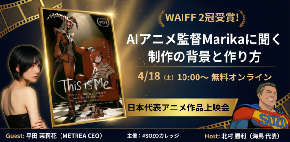 企業向け実用アニメの教育、研修、受託制作を手掛ける株式会社海馬(東京都/代表 北村勝利)は、WORLD AI FILM FESTIVAL 2026 in KYOTOにおいてグランプリにあたる「Japan Best AI Film」と「ベストAIアニメ賞」の2冠を達成した短編アニメーション『This is Me』の上映会およびアニメ監督Marika氏を招いたセミナーを開催いたします。