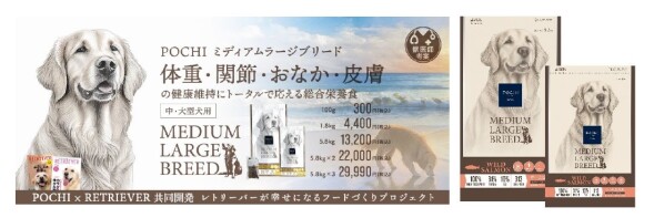 『POCHI ミディアムラージブリード』は、1998年創刊レトリーバーとの暮らしを楽しむライフスタイルマガジン『RETRIEVER』とのコラボ企画から誕生した、中・大型犬向けの総合栄養食です。「POCHIザ・ドッグフード ミディアムラージ粒」をリニューアルし、犬種特有の悩みに対応する栄養設計へと進化しました。