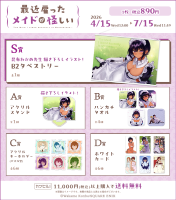 株式会社インクルーズ(東京都渋谷区、代表取締役社長 山﨑 健司)が企画・運営するフィジカルグッズのオンラインくじ「カワセルくじ」にて、4月15日(水)より、「最近雇ったメイドが怪しい」のくじが販売開始になりましたことをご報告させていただきます。