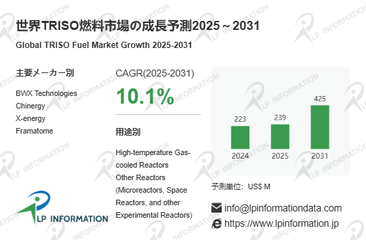 LP Information調査チームの最新レポートである「世界TRISO燃料市場の成長予測2025~2031」(https://www.lpinformation.jp/reports/162089/triso-fuel)によると、2025年から2031年の予測期間中のCAGRが10.1%で、2031年までにグローバルTRISO燃料市場規模は4.25億米ドルに達すると予測されている。この成長を支えるドライバーは複数ある。一つは地球規模で進む脱炭素とクリーンエネルギーへの転換需要だ。化石燃料依存からの脱却を目指す多くの国々が、ベースロード電源として原子力、特に安全性と効率性に優れた次世代炉(高温ガス炉、モジュール炉、マイクロ炉)を再評価している。TRISO燃料はこうした新世代炉との親和性が高く、特に事故耐性の高さが安全性への関心と合致する。