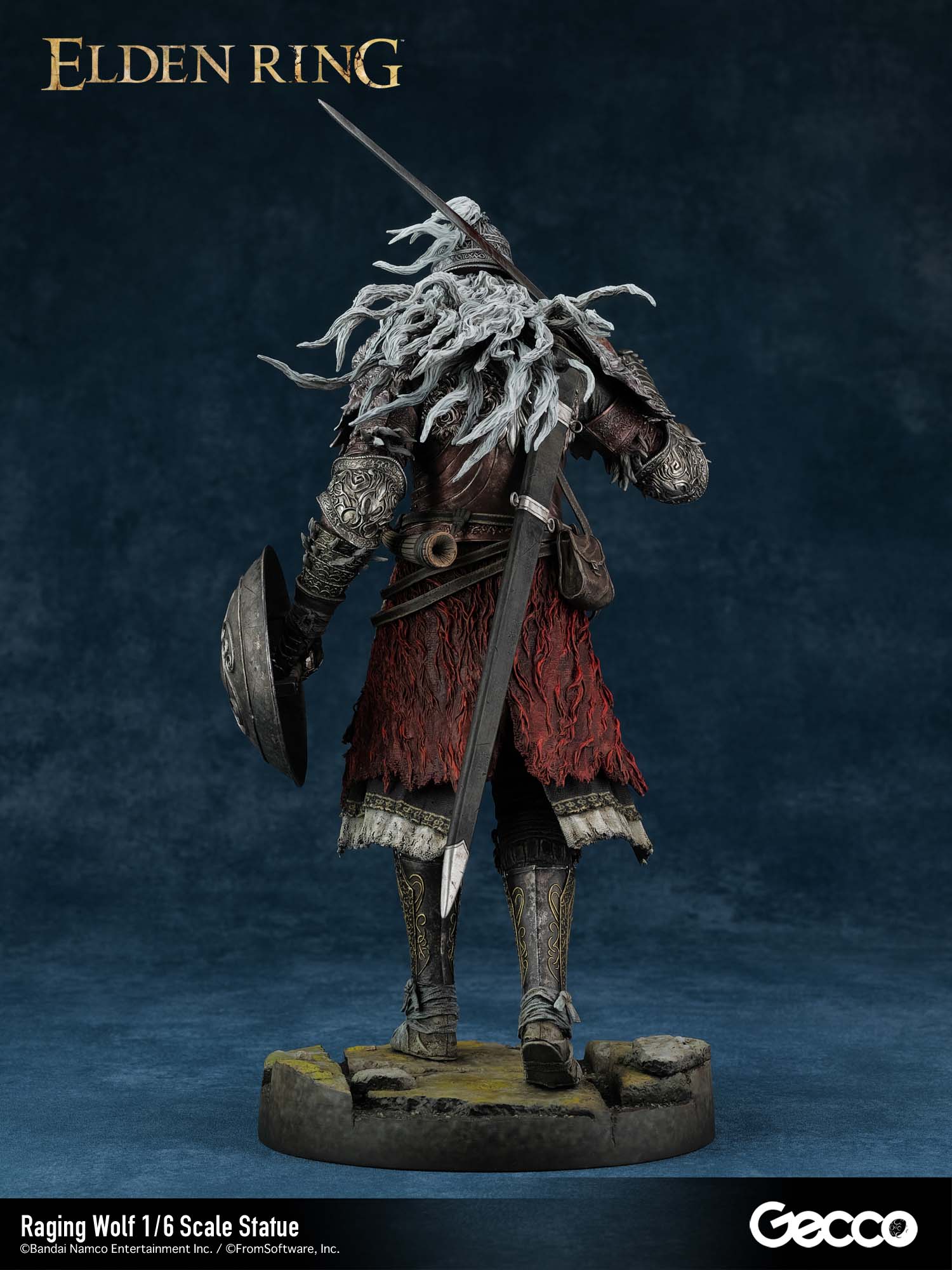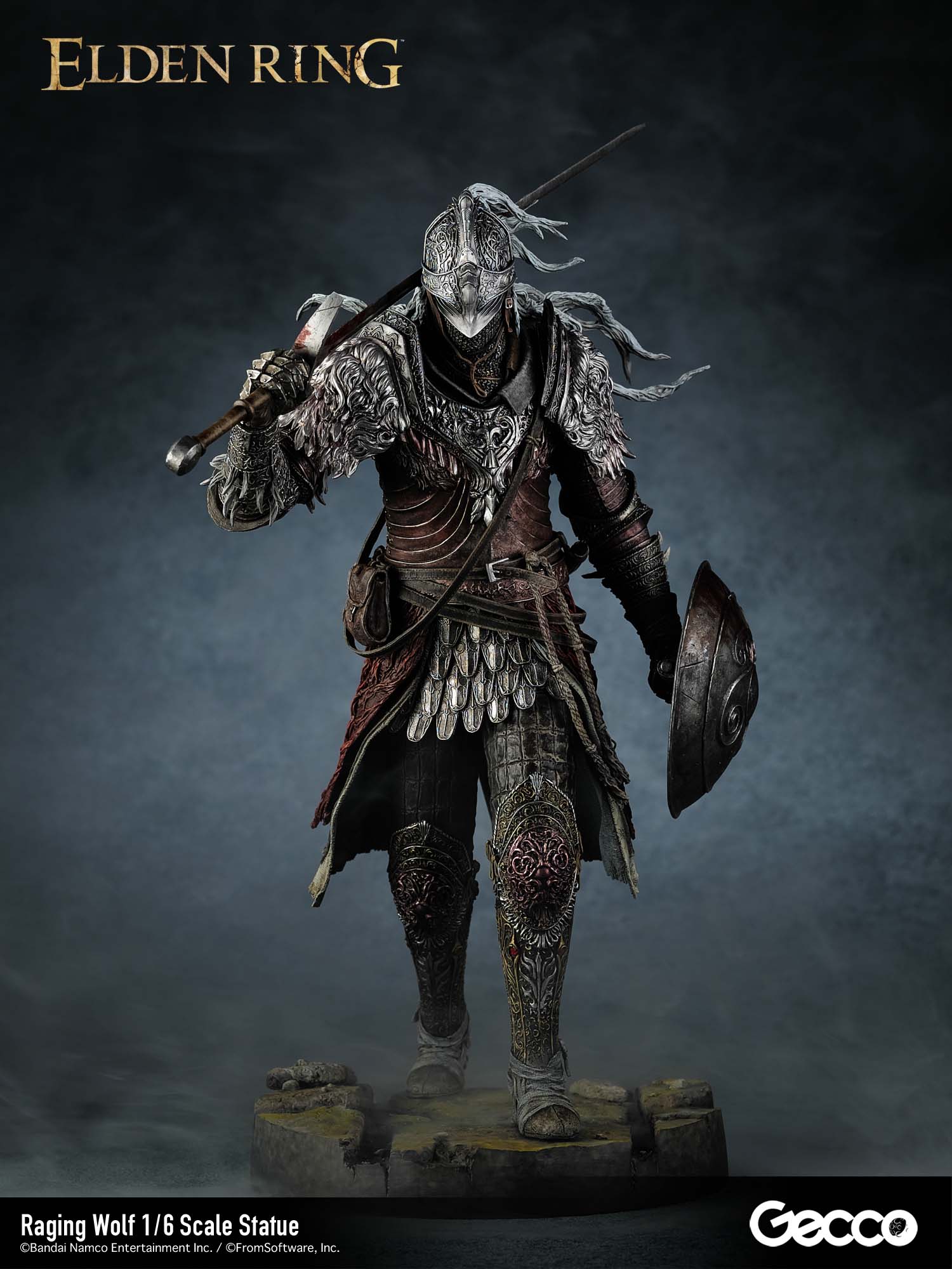 アクションRPG『ELDEN RING』より、戦鬼装備を纏った「褪せ人」が1/6スケールスタチューとして顕現。吹き荒れる向かい風の中、白銀の鬣をなびかせ、何人たりとも寄せ付けない威圧感を放ちながら荒野を征く姿を立体化。