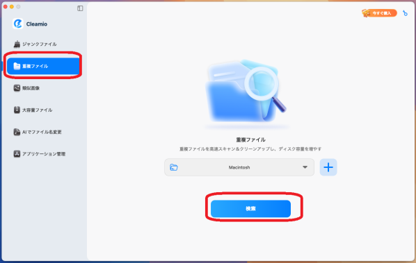 アプリを起動したら「重複ファイル」を選び、スキャン対象のフォルダを指定して「検索」をクリック。自動でスキャンが始まります。