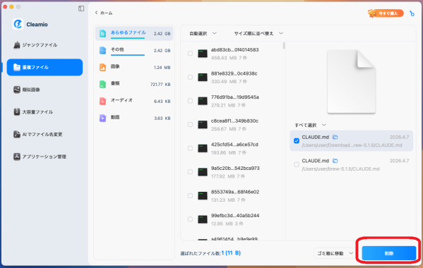 スキャンが終わると重複ファイルがグループ単位で一覧表示されます。各グループには保存場所とファイルサイズが表示され、「どちらを残してどちらを削除するか」を確認してから削除できます。