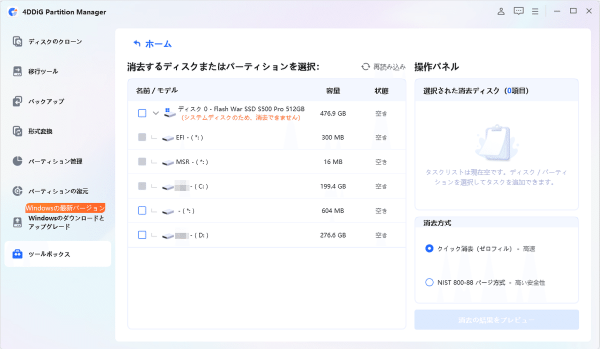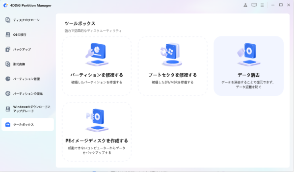 4DDiG Partition Managerは、データ消去だけでなく、システム移行やパーティション管理にも対応した多機能ソフトです。操作画面はシンプルで、初心者でも迷わず使える点が評価されています。