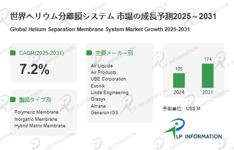 LP Information調査チームの最新レポートである「世界ヘリウム分離膜システム市場の成長予測2025~2031」(https://www.lpinformation.jp/reports/596183/helium-separation-membrane-system)によると、2025年から2031年の予測期間中のCAGRが7.2%で、2031年までにグローバルヘリウム分離膜システム市場規模は1.74億米ドルに達すると予測されている。背景には、半導体製造ライン拡張や核融合研究開発の進展、医療用途の拡大といった需要側の構造変化に加え、ヘリウムの供給制約が続く中で、低コストかつ高効率な抽出手段の必要性が高まっていることがある。従来の深冷分離方式に比べ、膜分離は稼働コストの低減、設備建設の迅速化、モジュール交換による柔軟なスケール調整が可能であり、天然ガス処理大手から研究施設、特殊ガス企業まで多様なプレイヤーが導入を進めている。低温技術に依存しない分離方式として、分散型ヘリウム回収の新たなソリューションを提供し、グローバルなヘリウムサプライチェーン全体の最適化を後押しする存在となっている。