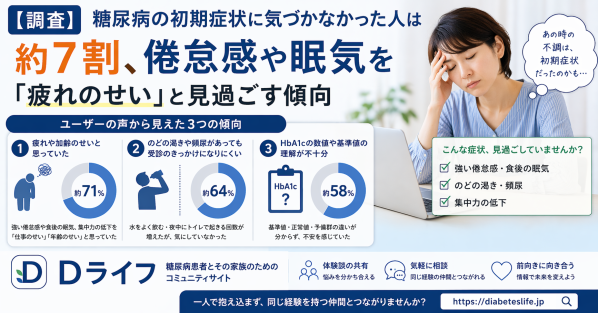 糖尿病患者とその家族のためのコミュニティサイト『Dライフ( https://diabeteslife.jp )』を運営する合同会社MYASIA Entertainmentは、このたび糖尿病の初期症状に関する相談傾向と検索動向をもとに、ユーザーの声を整理した調査結果をまとめました。健康診断でHbA1cの数値を指摘されて初めて糖尿病の可能性に気づく方が増えている一方で、振り返ると「あの時の不調が初期症状だった」と感じている方が多いことがわかってきました。