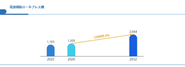 電気自動車(EV)市場は中長期的に拡大が見込まれており、電池生産能力の増強が世界各地で進められています。これに伴い、電池極板ロールプレス機の需要も継続的に増加し、大規模ギガファクトリー向けの高スループット設備や高耐久機種への需要が拡大する見通しです。
