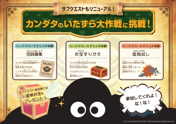 本サブクエストでは、「ドラゴンクエスト」シリーズでも有名なキャラクター「カンダタ」の意外な過去が明かされる、驚きのストーリーを体験頂けます。実際にオノコガルドの世界を歩き回りながら、隠されたストーリーを解き明かしましょう!