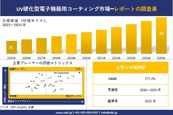 SDKI Analytics(本社:東京都渋谷区)は、このたび、2026年04月20に「UV硬化型電子機器用コーティング市場調査レポート:2026-2035年の市場規模、シェア、傾向の予測」を発表しました。UV硬化型電子機器用コーティングに関する市場調査レポートには、統計的および分析的アプローチを使用した予測評価が含まれています。この調査レポートでは、一次および二次調査方法を使用して分析された主要な業界洞察を通じて将来の傾向を理解できるようにすることで、主要な市場動向を読者に説明しています。
