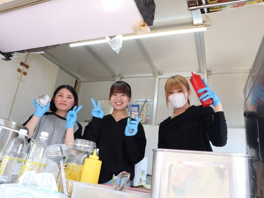 もうひとつは、有志で集まった本学こども心理学部・モチベーション行動科学部合同の商品開発プロジェクトチームによる「M_rise kitchen car」。あんバターホットドックや「しば」マヨポテトなど、発想力を活かしたオリジナルメニューを展開し、多くの来場者でにぎわいました。