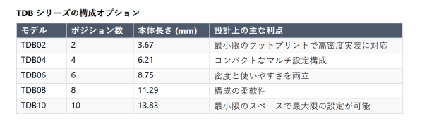 電子機器の小型化が進む中、設計者は電気性能や実装歩留まりを損なうことなく、限られたスペースにコンフィギュレーションスイッチやアドレス指定用スイッチを組み込むという課題に直面しています。TDBシリーズは、内部構造を大幅に小型化することで1.27mmハーフピッチの超小型フットプリントを実現し、高い電気的および機械的信頼性を維持しながら、より高密度な実装を可能にすることで、こうした課題に対応します。