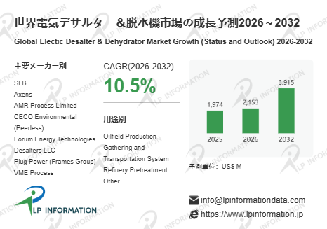 LP Information調査チームの最新レポートである「世界電気デサルター&脱水機市場の成長予測2026~2032」(https://www.lpinformation.jp/reports/598668/electic-desalter---dehydrator)によると、2026年から2032年の予測期間中のCAGRが10.5%で、2032年までにグローバル電気デサルター&脱水機市場規模は39.15億米ドルに達すると予測されている。この急拡大は単なる設備投資サイクルではなく、原油前処理に対する産業側の要求水準が一段上がったことを反映している。第一に、原油スレートの多様化が進み、重質化、高TAN、塩分や固形分の変動、エマルションの強化など、従来の運転余裕では吸収しきれない揺らぎが増えている。第二に、製油所やガス処理の稼働率が高止まりし、熱交換器のファウリング、腐食、塩化物由来のトラブルが操業停止に直結する局面が増えた。電気デサルター&脱水機は、トラブルが顕在化した後段で対症療法を積むよりも、前段で原因を断つという運転哲学に合致し、設備の信頼性投資として優先順位が上がりやすい。