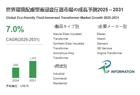 LP Information調査チームの最新レポート「世界環境配慮型液浸変圧器市場の成長予測2025~2031」(https://www.lpinformation.jp/reports/602695/eco-friendly-fluid-immersed-transformer)によると、同市場は2025年から2031年にかけて年平均成長率7.0%で拡大し、2031年には市場規模が11.03億米ドルに達すると予測されている。送配電網の老朽更新、新興国の電力需要増、先進国の脱炭素投資が重なり、需要は地域分散型で堅調に推移する見通しである。特に欧州、北米、アジア太平洋では環境基準と電力信頼性の両立が政策的に後押しされ、市場の底堅さを形成している。