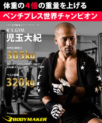 BODYMAKERサポートアスリートのベンチプレス世界王者「児玉大紀」は、昨年「KODAMAット」を共同開発。応援購入サイト「Makuake」で大ヒットバカ売れした。足を怪我しても「KODAMAット」のおかげで世界記録が出ました!(児玉大紀)直近では、83キロ級世界チャンピオンでノーギアの世界記録保持者、世界で最初に体重の4倍のベンチプレスを成功させている。現在ベンチプレスのための専用シューズやシャフト、グローブなど【BODYMAKERとの共同開発】を活動的に取り組んでいる。ベンチプレスもこの先どこまで記録を伸ばせるか。何かが始まろうとしている。「児玉大紀」の未知への挑戦は続く。