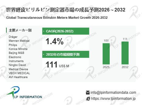 LP Information調査チームの最新レポートである「世界経皮ビリルビン測定器市場の成長予測2026~2032」(https://www.lpinformation.jp/reports/598820/transcutaneous-bilirubin-meters)によると、2026年から2032年の予測期間中のCAGRが1.4%で、2032年までにグローバル経皮ビリルビン測定器市場規模は1.11億米ドルに達すると予測されている。新生児黄疸は世界的に発生頻度の高い症状であり、地域や医療制度の違いを超えて一定の診療需要が存在する。この普遍性が市場の底堅さを支えている。一方で、医療現場では検査効率の向上、医療従事者の業務負荷軽減、患者安全性の確保が同時に求められており、非侵襲で繰り返し測定可能な経皮方式は合理的な選択肢として定着してきた。2020年代前半にかけて市場は緩やかな成長を示したが、今後は数量拡大よりも高付加価値化や更新需要が中心となる構造へと移行しつつある。測定精度の安定性、データ管理機能、院内システムとの連携といった要素が、製品評価の重要な軸になっている点が、現在の市場を特徴づけている。