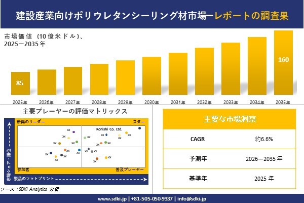 SDKI Analytics(本社:東京都渋谷区)は、このたび、2026年04月17に「建設産業向けポリウレタンシーリング材市場調査レポート:2026-2035年の市場規模、シェア、傾向の予測」を発表しました。建設産業向けポリウレタンシーリング材に関する市場調査レポートには、統計的および分析的アプローチを使用した予測評価が含まれています。この調査レポートでは、一次および二次調査方法を使用して分析された主要な業界洞察を通じて将来の傾向を理解できるようにすることで、主要な市場動向を読者に説明しています。