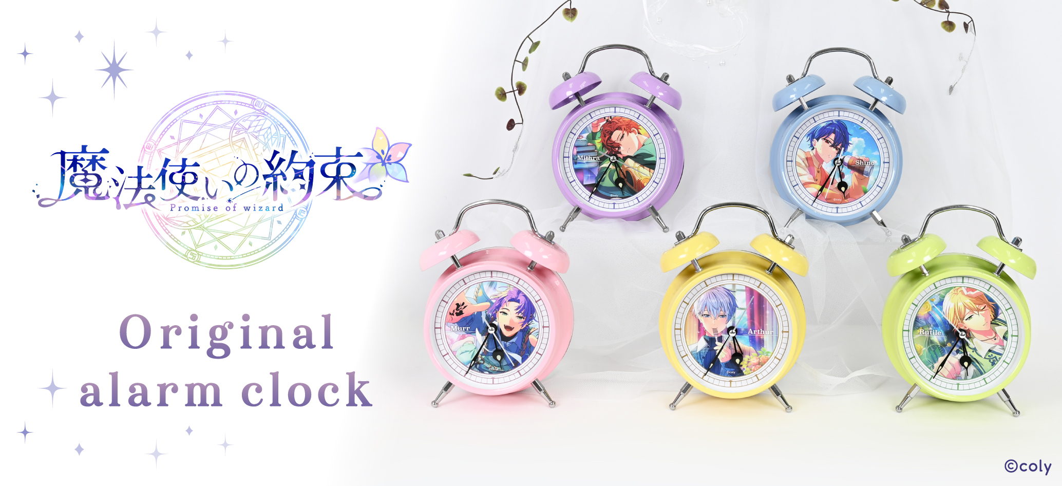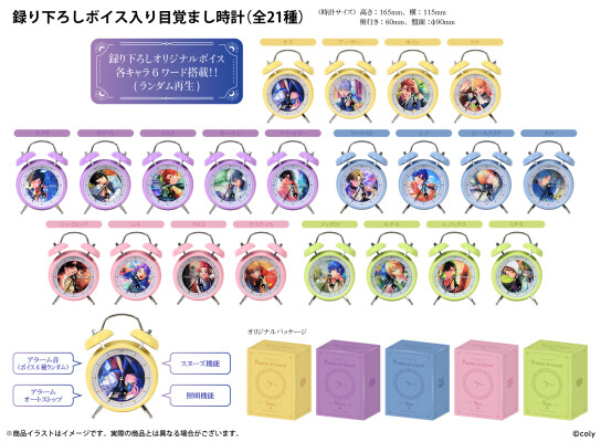 昨年11月にリリース6周年を迎えたスマートフォン向けアプリゲーム『魔法使いの約束』から「中央の国」「北の国」「東の国」「西の国」「南の国」全21キャラクターとの録り下ろしボイス入り目覚まし時計の受注販売を致します。