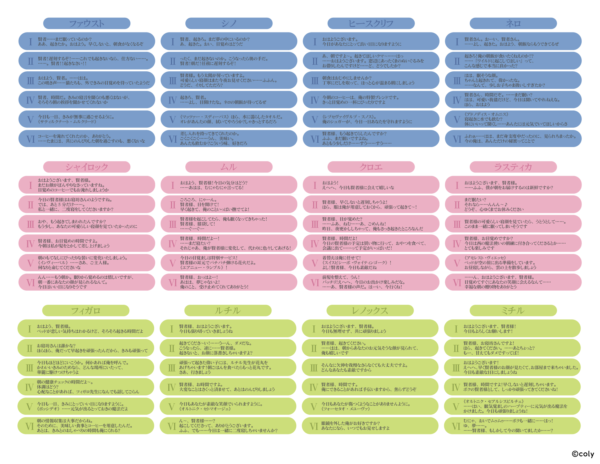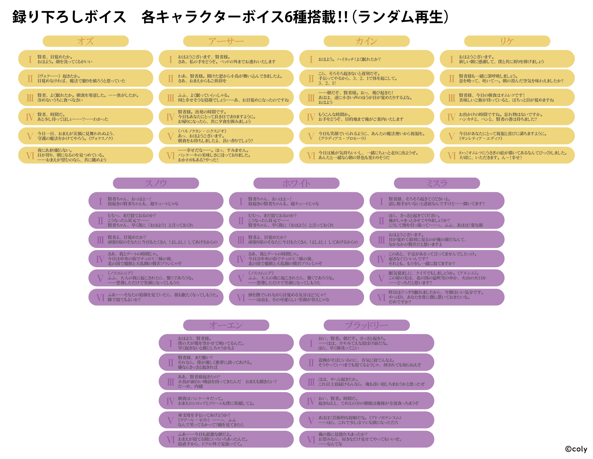 また搭載されるキャラクターボイスは各6種ずつ(※ランダム再生)で「中央の国」のオズ(cv.近藤 隆)、アーサー(cv.田丸 篤志)、カイン(cv.神原 大地)、リケ(cv.永野 由祐)、「北の国」のスノウ(cv.鈴木 千尋) 、ホワイト(cv.寺島 拓篤)、ミスラ(cv.高橋 広樹)、オーエン(cv.浅沼 晋太郎)、ブラッドリー(cv.日野 聡)、「東の国」のファウスト(cv.伊東 健人)、シノ(cv.岡本 信彦)、ヒースクリフ(cv.河本 啓佑)、ネロ(cv.杉山 紀彰)、「西の国」のシャイロック(cv.立花 慎之介) 、ムル(cv.仲村 水希)、クロエ(cv.天﨑 滉平)、ラスティカ(cv.三浦 勝之)、「南の国」のフィガロ(cv.森川 智之)、ルチル(cv.土岐 隼一)、レノックス(cv.帆世 雄一)、ミチル(cv.村瀬 歩)の完全録り下ろしとなっております。