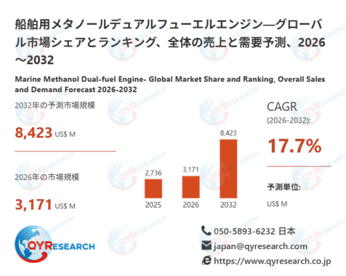 QYResearch調査チームの最新レポート「船舶用メタノールデュアルフューエルエンジン―グローバル市場シェアとランキング、全体の売上と需要予測、2026~2032」によると、船舶用メタノールデュアルフューエルエンジンの世界市場は、2025年に2736百万米ドルと推定され、2026年には3171百万米ドルに達すると予測されています。その後、2026年から2032年にかけて年平均成長率(CAGR)17.7%で推移し、2032年には8423百万米ドルに拡大すると見込まれています。
